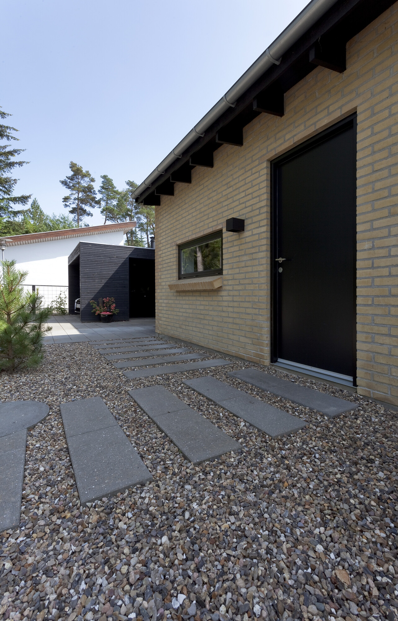 Brug fliser til at markere hovedindgangen og vejen ind til dit hus. Det virker opfordrende til at komme på besøg og viser tydeligt, hvor hoveddøren er. Du kan fx gøre som arkitekt Allan Lorenzen og lægge fliserne med mellemrum i et hav af perlesten. Se mere fra huset hos Danske BoligArkitekter.