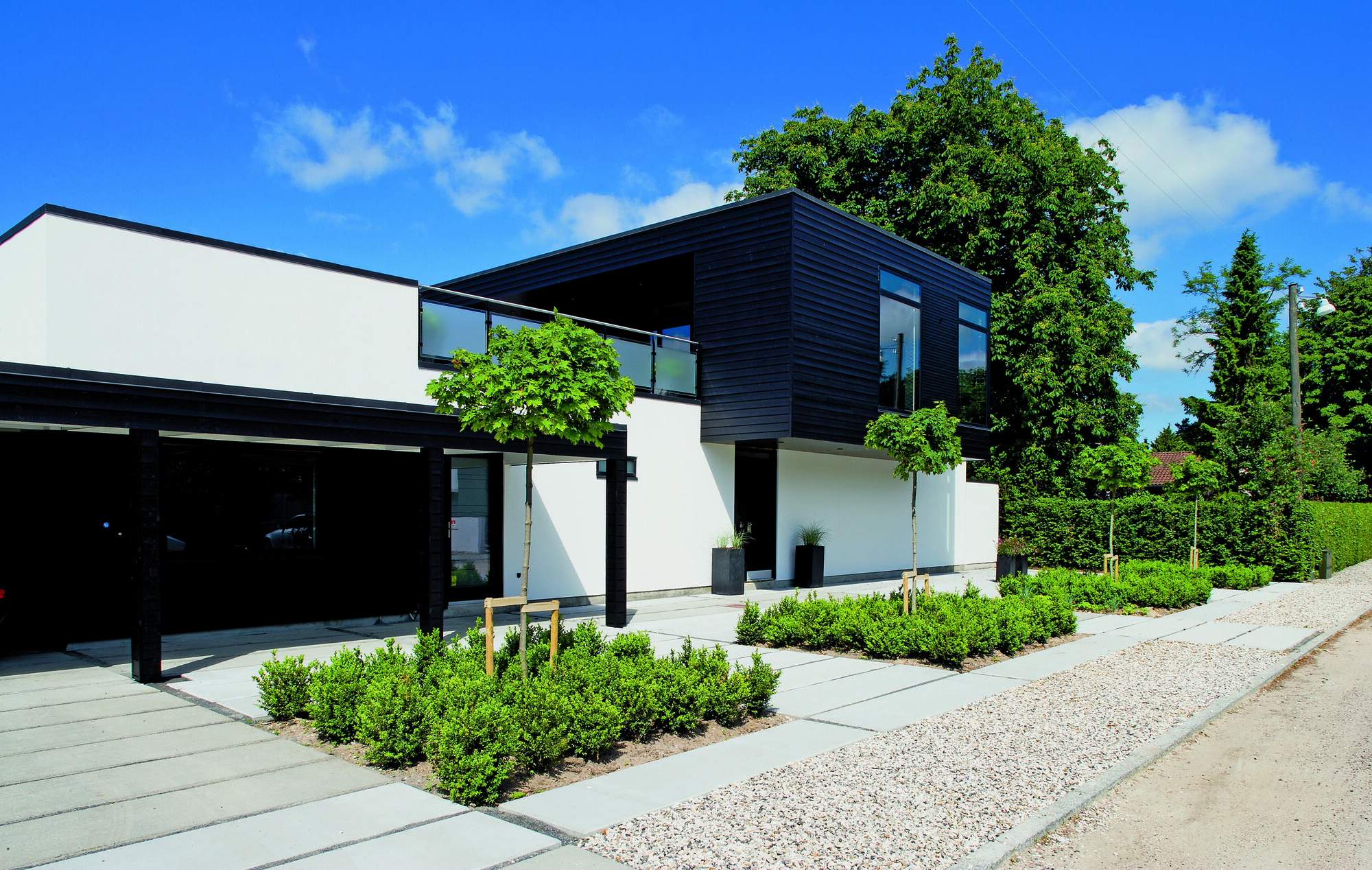 Kopier linjerne fra dit hus, når du skal indrette din forhave. Det har arkitekt Lars Bo Poulsen gjort her, hvor facadens stramme og lige linjer går igen i belægningen - næsten som hvis det spejlede sig. Se mere fra huset hos Danske BoligArkitekter.