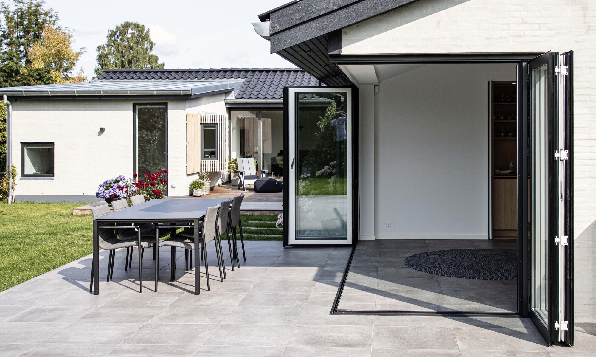 Lægger du den samme belægning indenfor som udenfor, får du bundet inde og ude sammen på en elegant måde. Lad højden på gulve og belægning være den samme og indsæt store skydedøre mellem rummene, så inde og ude kan flyde fuldstændig sammen til ét stort rum.