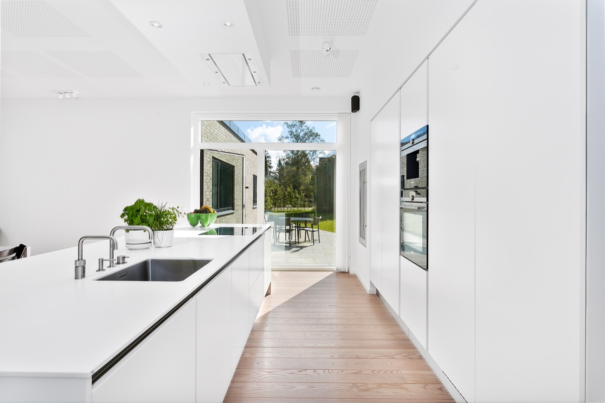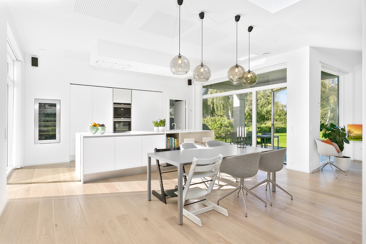 Der er tænkt over alle detaljer i denne nybyggede funkisinspirerede luksusvilla i Virum. Her er to højloftede stuer i direkte forbindelse til et moderne køkken med en stor kogeømed Vola armaturer og vinkøleskab fra Liebherr. De integrerede hvidevarer fra Siemens topmodeller har wi-fi, så du kan tjekke kalvestegen på din telefon og brygge morgenkaffen fra sengen. De gennemgående egetræsplankegulve med gulvvarme samler alrummet og sammenlagt er huset meget let at leve i. Se mere information omkring ejendommen her.