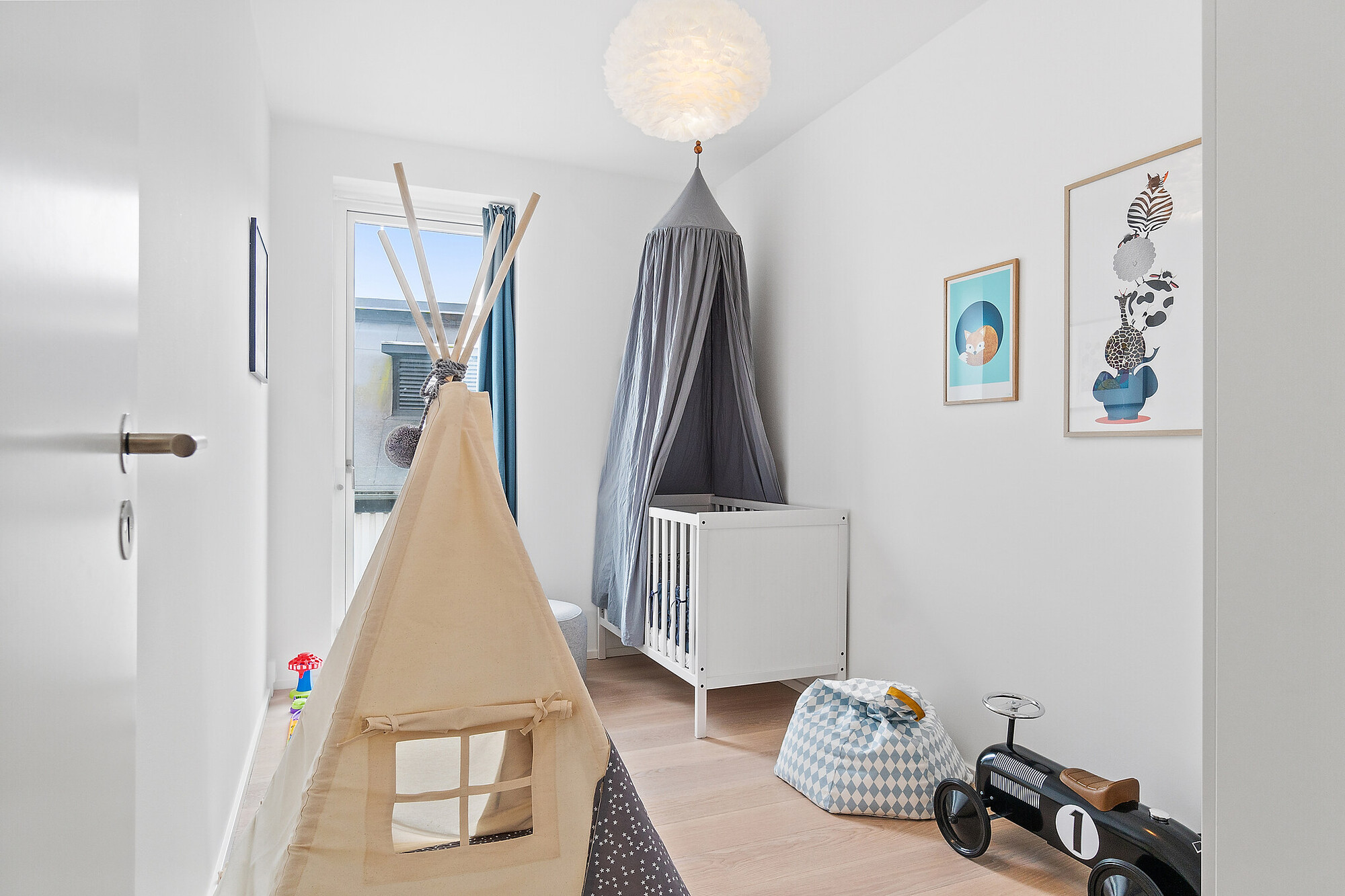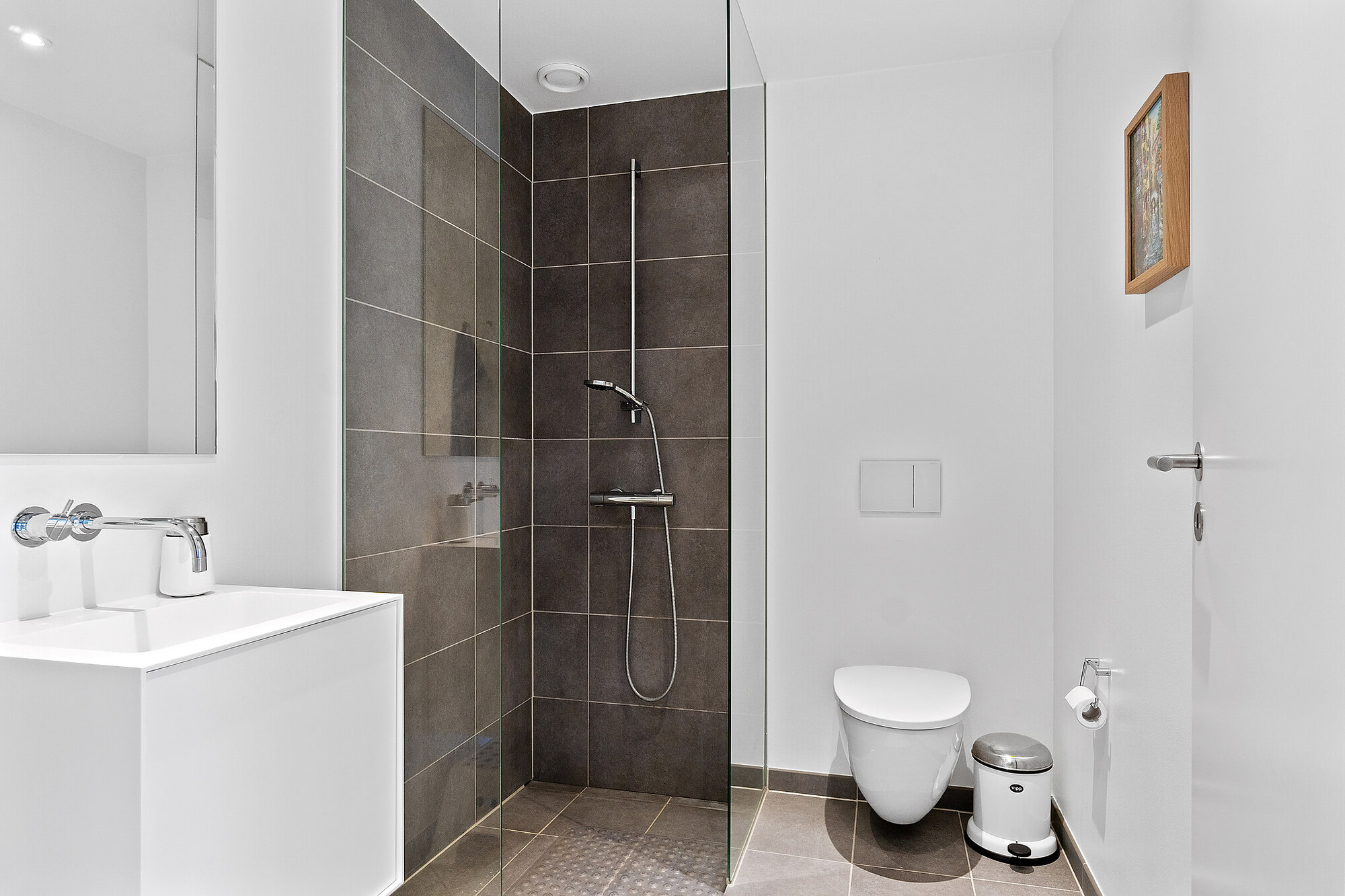 På badeværelset fortsætter den moderne æstetik med Dornbracht brusearmaturer og Copenhagen Bath-elementer, og de samme mærker er ført videre på førstesalens badeværelse. Resten af førstesal gemmer desuden på tre gode værelser, inden I endeligt finder stuen placeret på anden sal. Stuen har en skøn vindueskarnap i den ene ende og et skydedørsparti i den anden, som giver adgang til den lækre tagterrasse, der er en lille oase helt afskærmet fra naboers blikke.