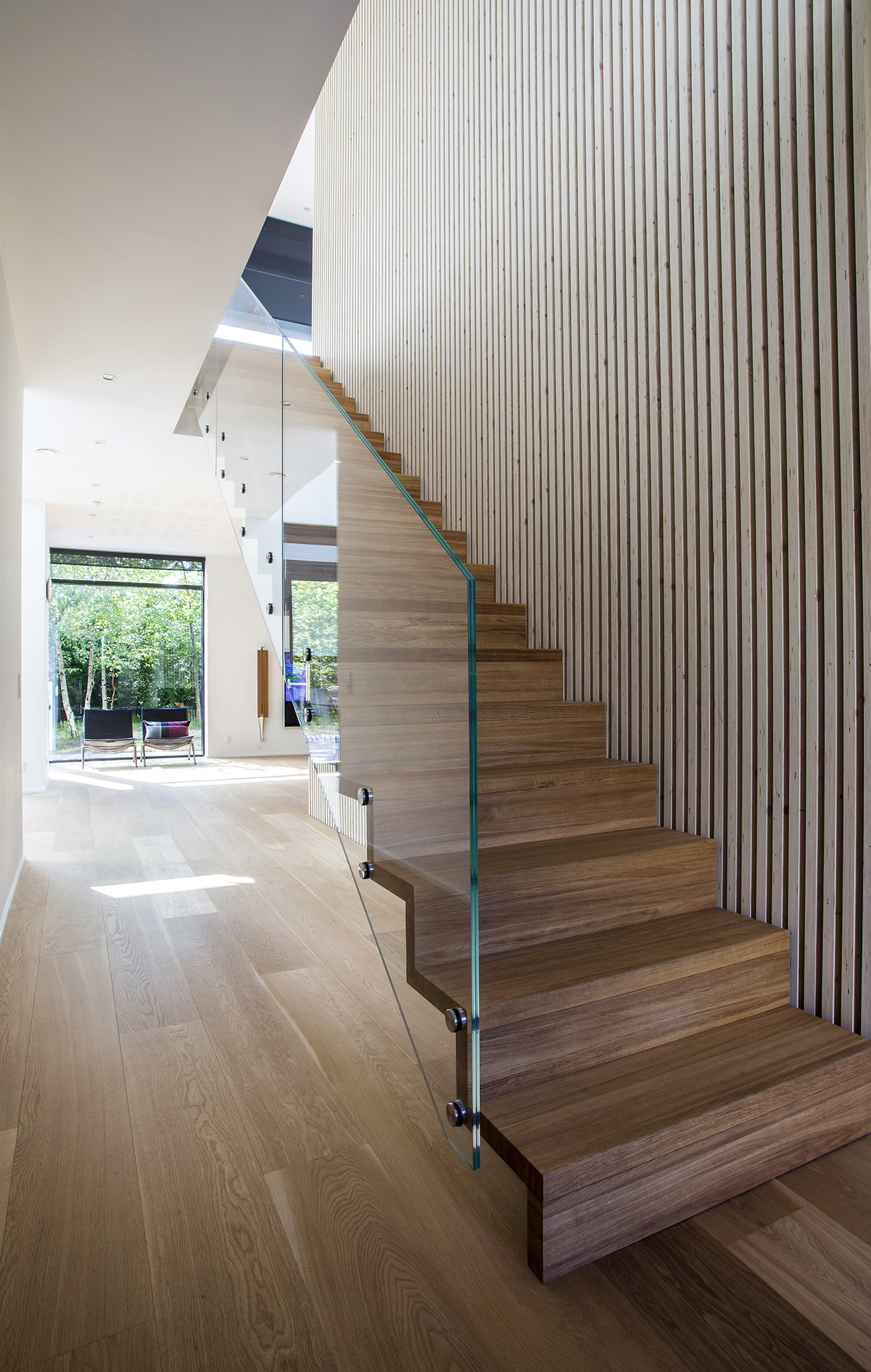 Lameller i træ kan gøre underværker for din akustik og er samtidig blevet meget moderne de seneste år. Listerne fungerer ikke kun på loftet. De kan også sættes på væggen som her ved trappen eller kaminen. Trapper er ofte et ømt punkt i et hjem, når det gælder akustik. Her er der nemlig typisk højt til loftet, og samtidig tramper du gerne lidt hårdere, end når du ellers går. Vær derfor ekstra opmærksom på materialer og akustikken her. Se mere fra huset hos Danske Boligarkitekter her.