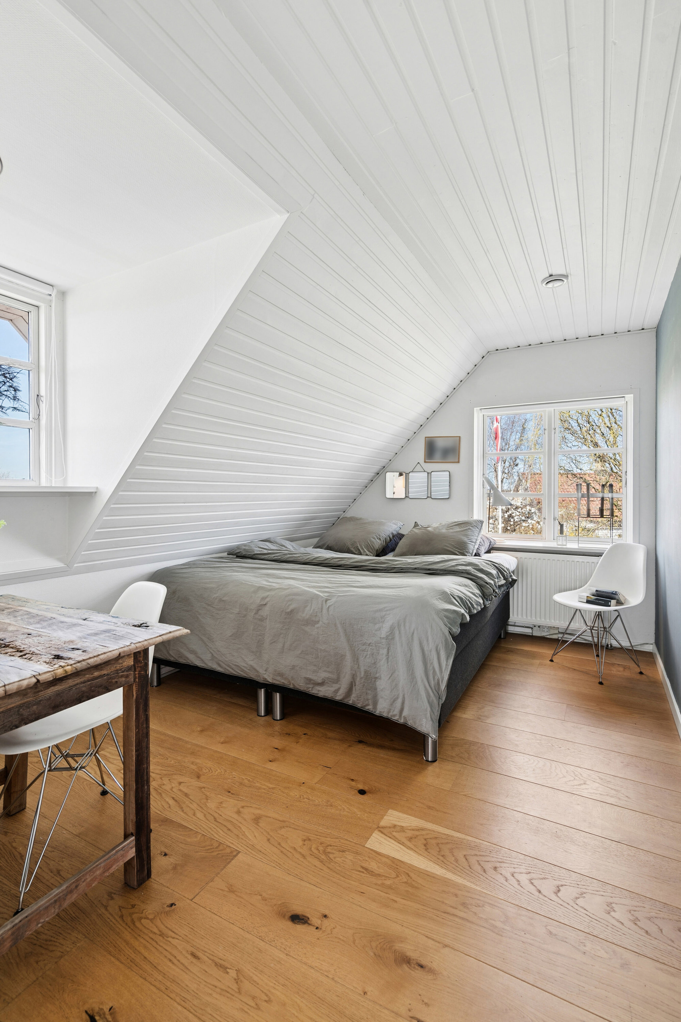 På første sal finder man tre gode soveværelser med skrå, hvidmalede bræddelofter og egetræsgulve, der giver etagen en rolig og lun karakter. Reposrummet samler etagen og fungerer naturligt som familierum eller stille arbejdssted — og leder videre ud til altanen, en stor halvrund tagterrasse med udsigt over haven og åben himmel.