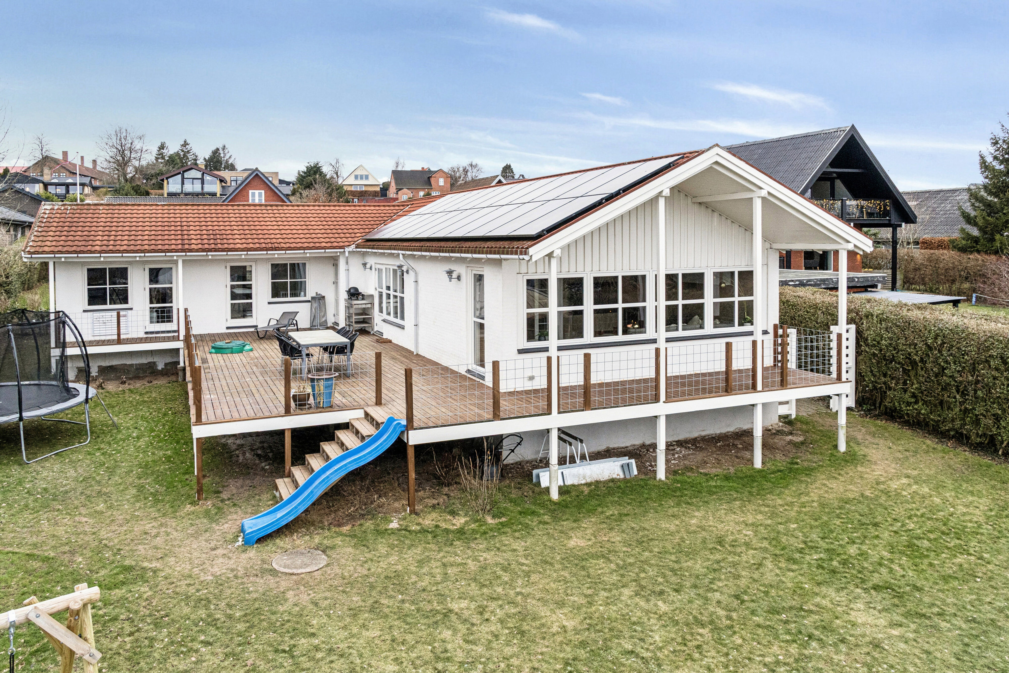 Udelivet centrerer sig omkring den anseelige træterrasse, der føles som en forlængelse af boligen i sommermånederne. Haven er rig på liv i form af frugttræer og bærbuske, og som udsigten fra grunden indikerer, er naturen og vandet ikke langt herfra. Ligeledes vil børnefamilien med garanti værdsætte den korte gåtur til Skødstrup Skole og idrætsfaciliteterne, der knytter sig til den, ligesom I til fods når både legepladser, daginstitutioner og indkøbsmuligheder.