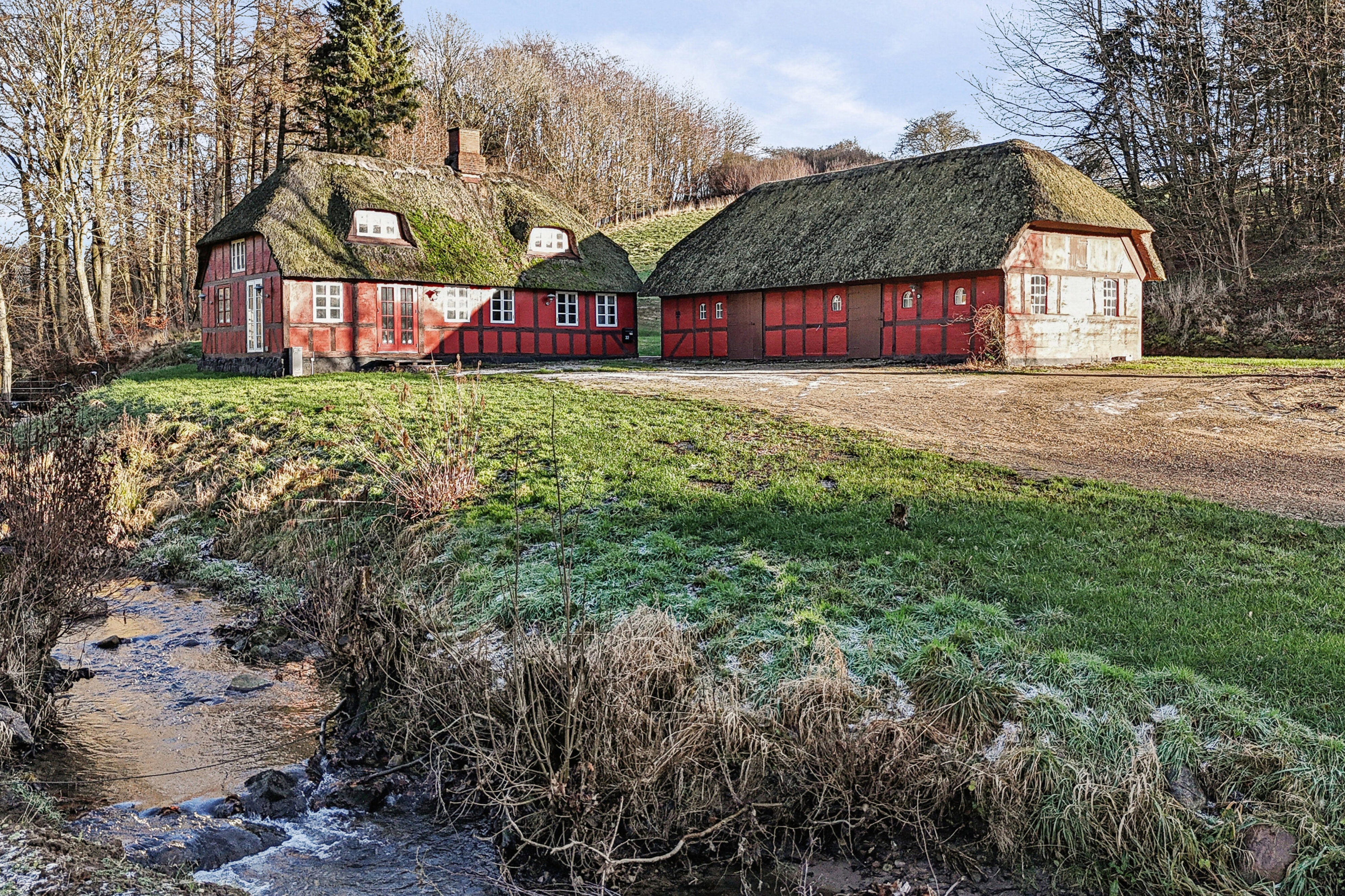 For enden af en idyllisk privatvej, omkranset af skov og natur, ligger denne enestående ejendom fuldstændig ugeneret af omgivelserne. Allerede ved ankomsten mærker man roen. En lille bæk risler forbi ejendommen, og adgangen sker via en charmerende bro – netop anlagt af de nuværende ejere – som på fineste vis markerer overgangen til et liv tættere på naturen.