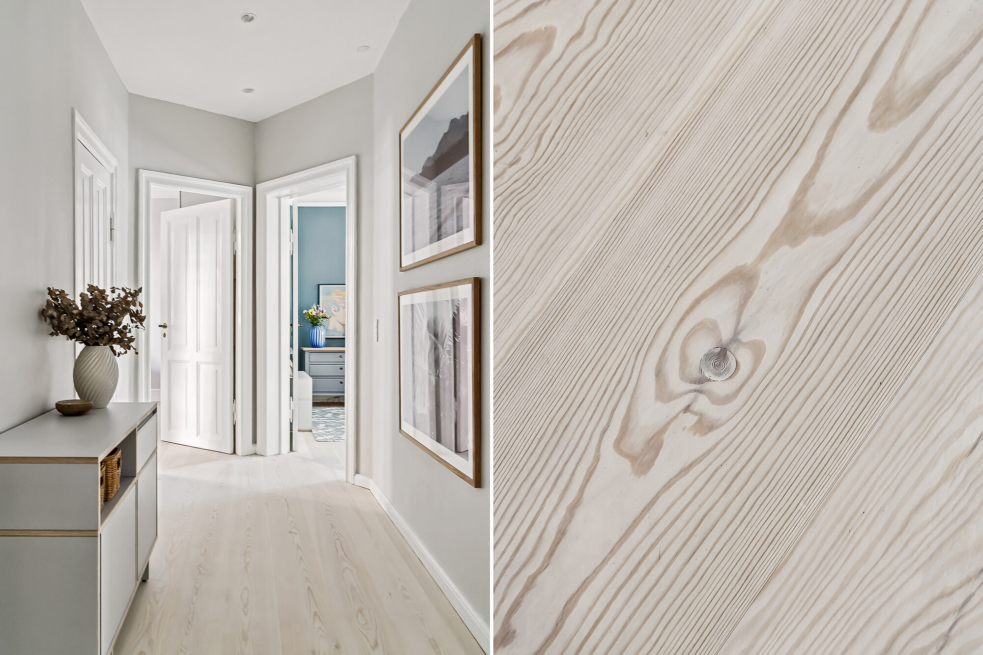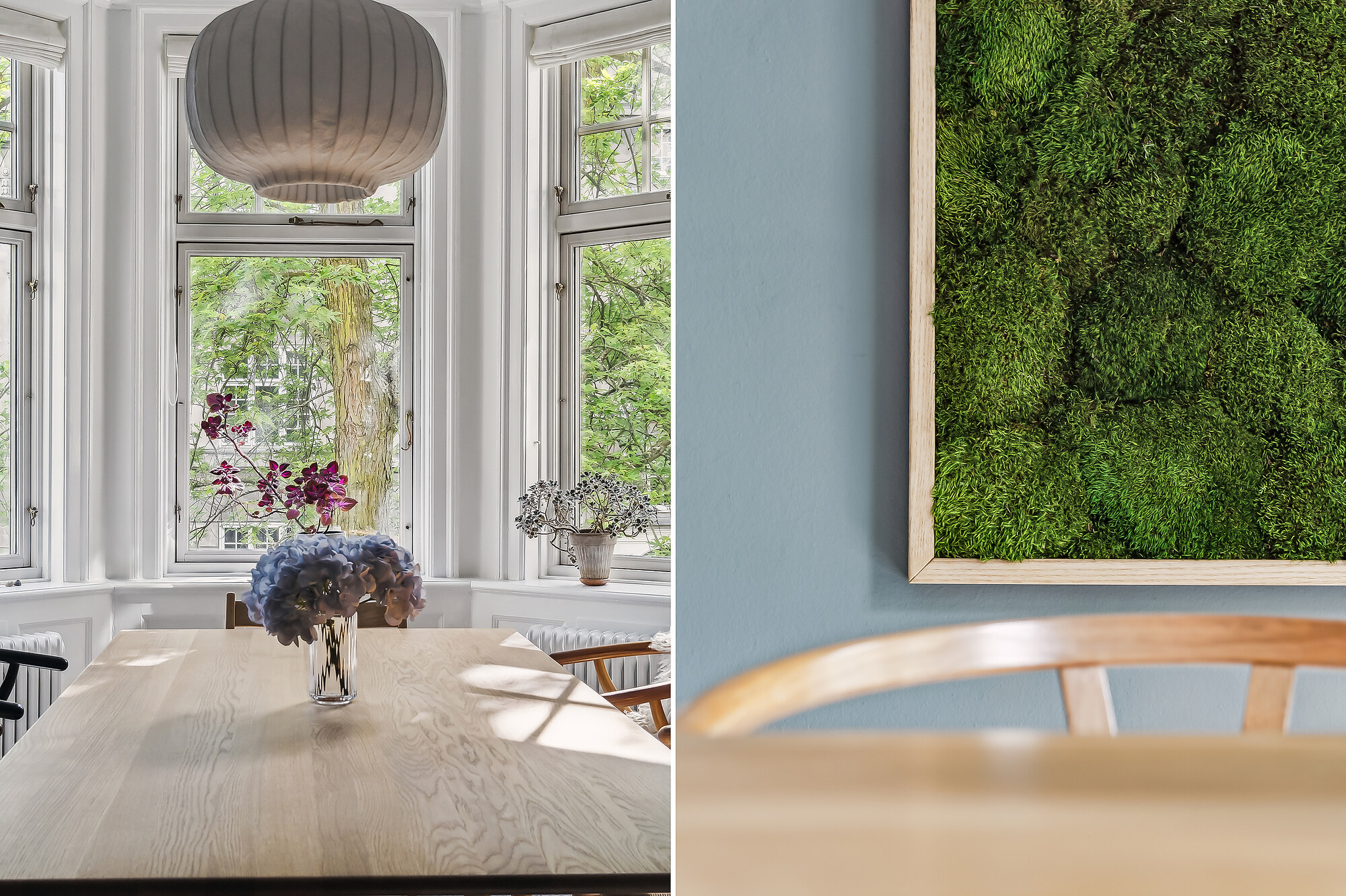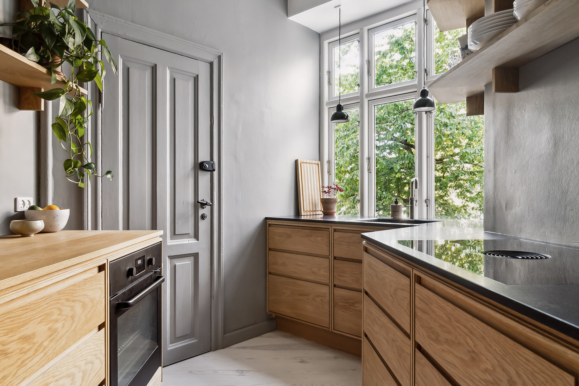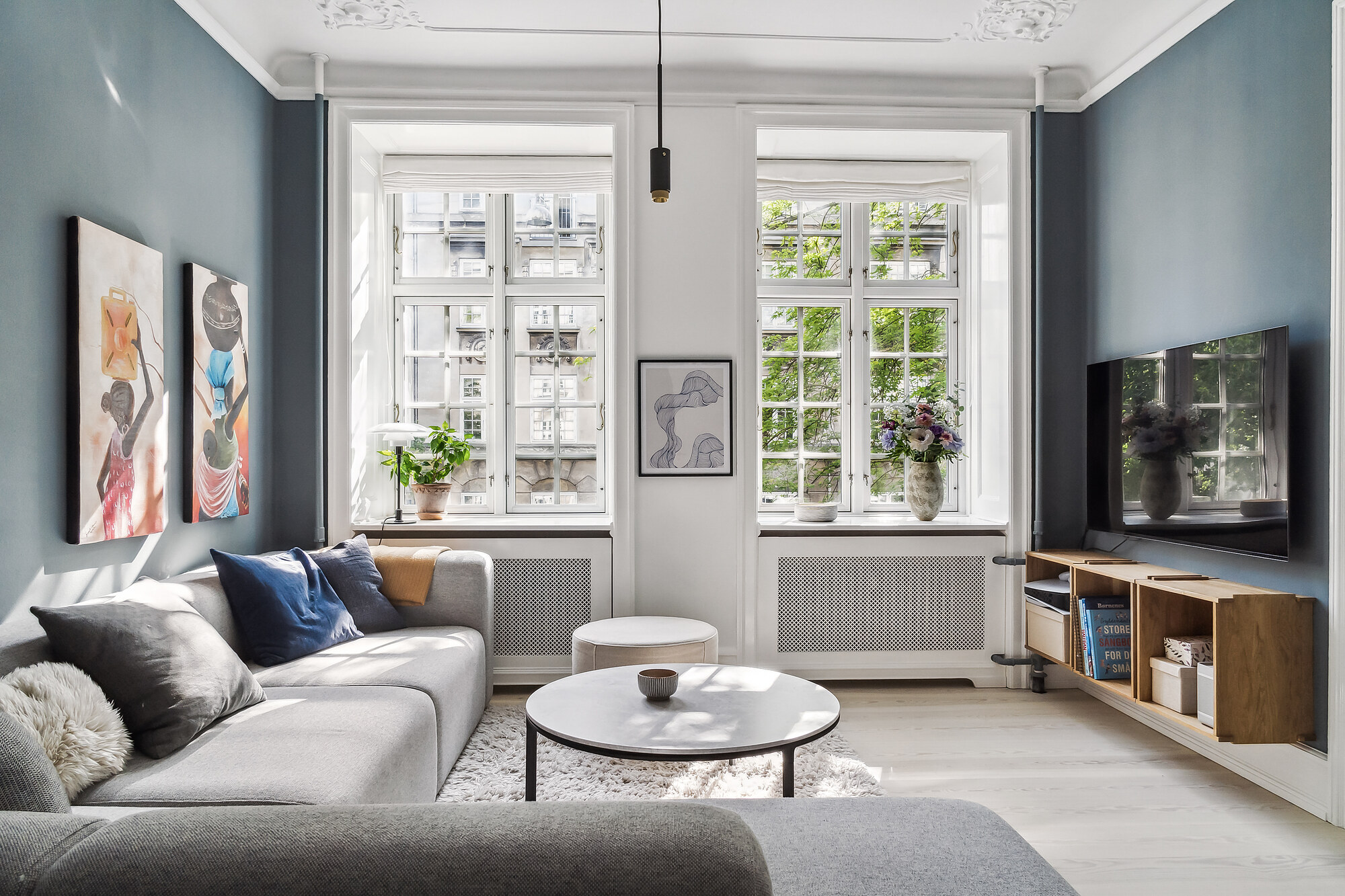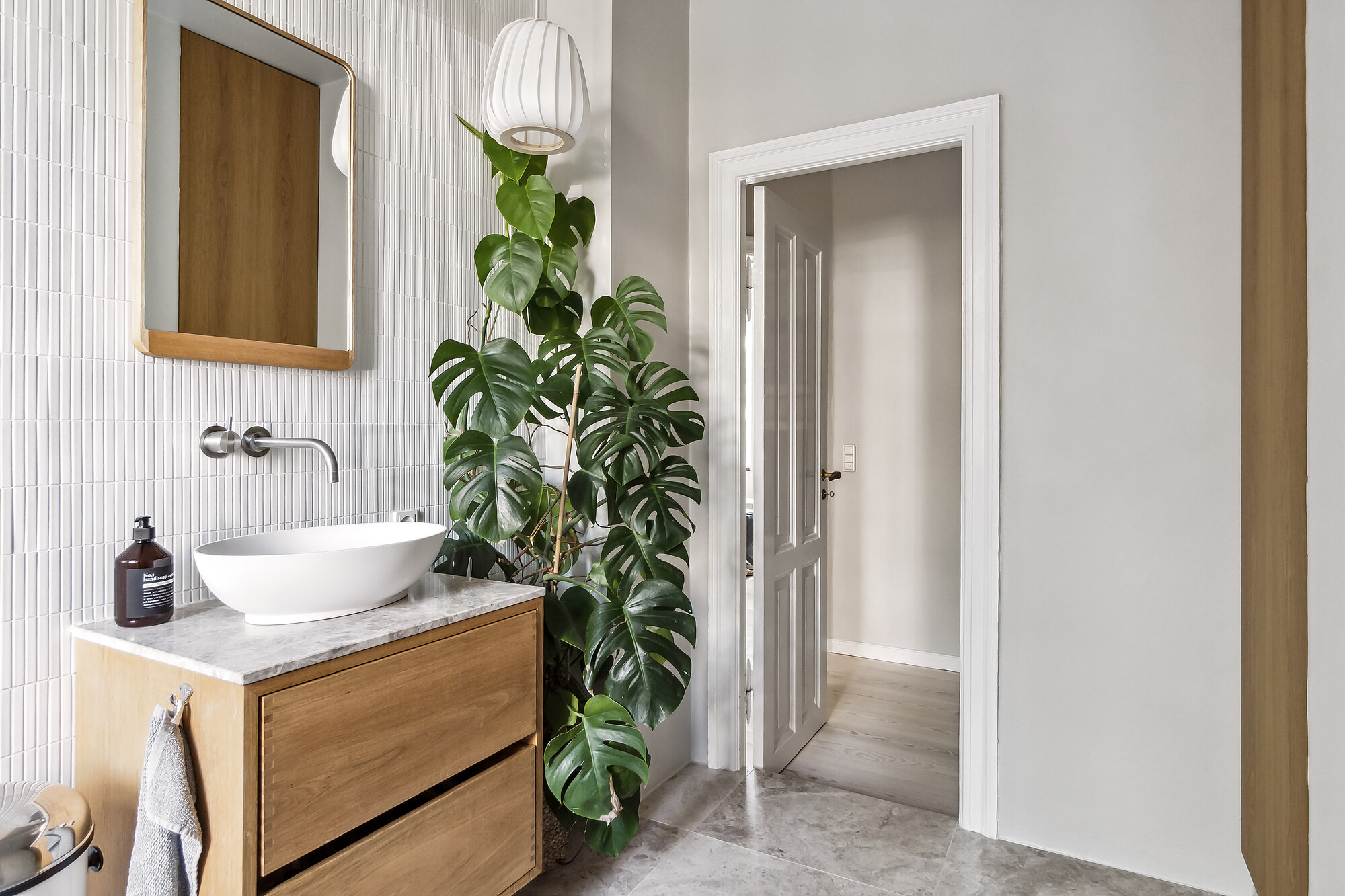 Ejendommens bevaringsværdige facade må være en af de smukkeste på Frederiksberg, og den slår i den grad tonen an for et flot hjem. Boligen, som er fuld af eksklusive løsninger, blev moderniseret i 2021 med stor respekt for den oprindelige stil og sjæl. I forbindelse med renoveringen blev der flyttet en væg, lavet elinstallationer, fornyet køkken, badeværelse og Dinesen-plankegulv i fyrretræ i hele længder. Køkkenet er et specialdesignet snedkerkøkken i egetræ fra Koch Køkken, og i badeværelset er Arne Jacobsens ikoniske designarmaturer at finde.